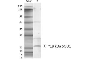 - Superoxide dismutase (SOD) is an endogenously produced intracellular enzyme present in almost every cell in the body (2). It works by catalyzing the dismutation of the superoxide radical O2ˉ to O2 and H2O2, which are then metabolized to H2O and O2 by catalase and glutathione peroxidase (1,4). In general, SODs play a major role in antioxidant defense mechanisms (3). There are two main types of SOD in mammalian cells. One form (SOD1) contains Cu and Zn ions as a homodimer and exists in the cytoplasm. The two subunits of 16 kDa each are linked by two cysteines forming an intra-subunit disulphide bridge (2). Misfolding of SOD1 has been implicated in Amyotrophic lateral sclerosis (ALS). Therefore conformation specific antibodies such as SOD1 (EDI), which targets an exposed region of the dimer interface (EDI) of SOD1, are useful for determining the conformation of SOD1 in affected tissues (5). This antibody can be used in conjunction with SOD1 (UβB) (SPC-205D) which detects an unfolded beta barrel (UβB) of SOD1.