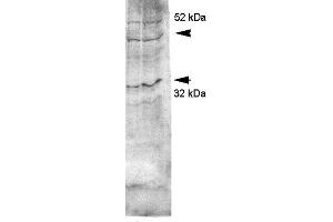 - Detects ~35 kDa. May detect larger glycosylated bands ~50 kDa.