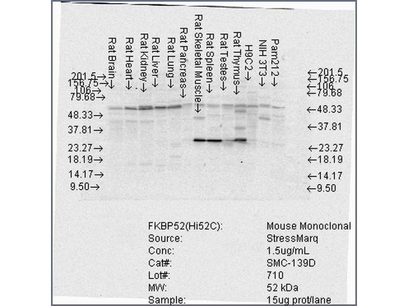0.5 μg/ml was sufficient for detection of FKBP52 in 20 μg total protein using WB by colorimetric immunoblot analysis using Goat Anti-Mouse IgG:HRP as the secondary.