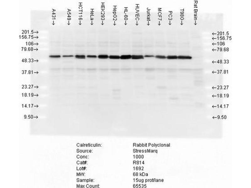 A 1:1000 dilution of ABIN2486723 was sufficient for detection of Calreticulin in 20 μg of HeLa cell lysate by ECL immunoblot analysis.
