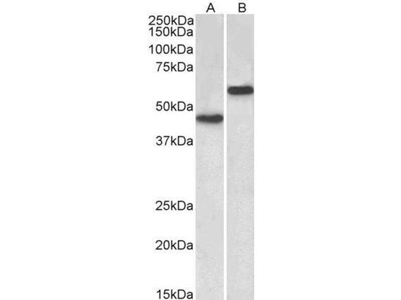 Western Blot: Approx 45 kDa band observed in Human Brain (Cerebellum) and 60 kDa in Human Liver lysates (calculated MW of 35.2 kDa according to NP_006682.2). The observed molecular weights correspond to the different glycosylated forms. Recommended concentr