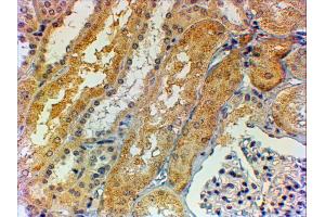 Immunohistochemistry: In paraffin embedded Human Kidney shows preferential staining in cytoplasm of PCT over DCT. Recommended concentration, 2-4 μg/mL.