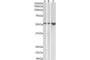 Western Blot: Approx 52 kDa band observed in Human Kidney, Testis and Uterus lysates (calculated MW of 39.2 kDa according to NP_036338.2). This molecular weight is routinely observed by other sources. Recommended concentration: 1-3 μg/mL.