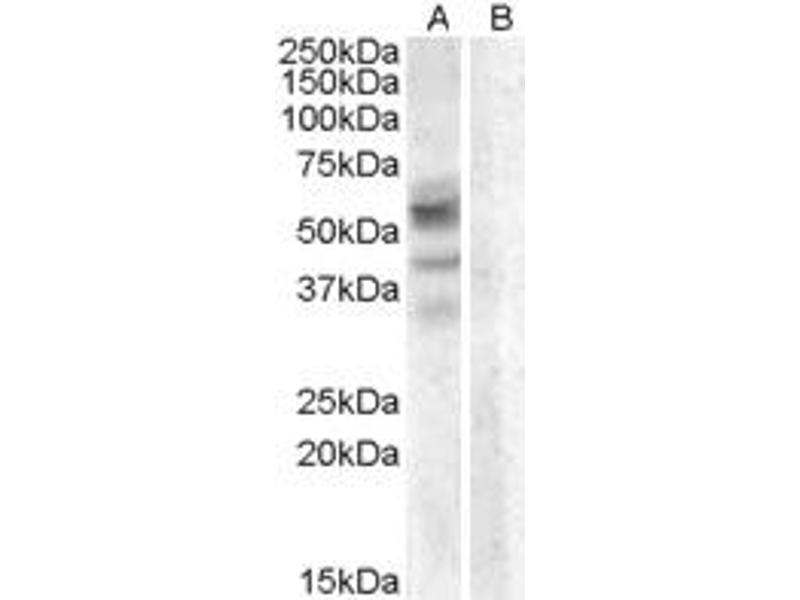 Western Blot: Approx 60+40 kDa bands observed in lysates of cell lines A549 and HepG2 (calculated MW of 64.9 kDa according to NP_001660.2 and of 42.3 according to NP_033667.2). Recommended concentration: 0.3-1 μg/mL. An additional band of unknown identity