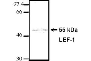 Lymphoid Enhancer Factor-1 is a transcription factor of the High Mobility Group of DNA binding proteins. It is one member of a family of four proteins referred to as LEF/TCF transcription factors (LEF-1, TCF-1, TCF-3 and TCF-4). These factors play a crucial role in WNT/WIngless signaling, a signal transduction cascade that directs cell differentiation. Aberrant activation of the WNT/Wingless pathway is also a root cause in the genesis of certain cancers such as colon cancer, melanoma and breast cancer.LEF-1 is expressed during development in many different differentiating tissues, and in a few tissues after birth. LEF-1 expression is required for proper development of breast, teeth, hair, whiskers and the trigeminal nerve. It is redundant with TCF-1 (for T Cell Factor-1) for correct development of T lymphocytes in the thymus. LEF-1 is a 399 amino acid protein that appears as a cluster of polypeptides ranging in size between 55-57 kD on SDS-PAGE analysis. Alternative splice forms of LEF-1 and other LEF/TCF family members have been identified, but the expression pattern and relative abundance of these alternative forms have not been well studied. They can appear on westerns as smaller immunoreactive forms.Synonyms: LEF-1, Lymphoid enhancer-binding factor 1, T cell-specific transcription factor 1-alpha, TCF1-alpha