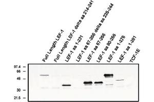Western Blot: Detect LEF-1 protein containing the alternately spliced exon between aminoacids 212-241 at 1-5 μg/mL. Positive Control: Cos cells transfected with LEF-1 protein. Other applications not tested. Optimal dilutions are dependent on conditions and should be determined by the user.