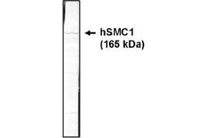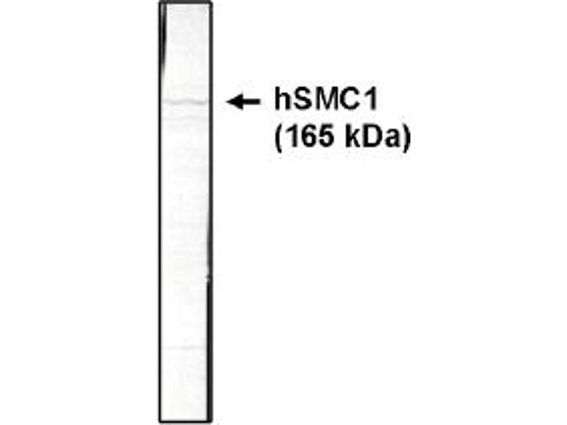 Structural Maintenance of Chromosomes (SMC) family proteins play critical roles in various nuclear events that require structural changes of chromosomes, including mitotic chromosome organization, DNA recombination and repair and global transcriptional repression. The chromosome proteins are conserved in eukaryotes lead to mitotic chromosome segregation defects, suggesting a critical function of SMC family proteins in mitotic chromosome dynamics. SMC1 and SMC3 form a heterodimeric complex required for metaphase progression in mitotic cells. Specifically this SMC1/SMC3 complex is responsible for sister chromatid cohesion during metaphase. A number of cellular factors interact with hSMC1/hSMC3 during cell cycle. The major population of hSMC1/hSMC3 is in a compex with hRAD21 forming the human cohesion complex. Human cohesion associates with chromosomes which peaks at S phase and dissociates from chromosomes during G2/M transition. In addition, a subpopulation of hSMC1/hSMC3 associates tightly with nuclear matrix and centrosomes during interphase. A subset of hSMC1/hSMC3 is localized to spindle poles, spindles and kinetochores during mitosis when cohesin is in the cytoplasm. hSMC1/hSMC3 is required for spindle aster formation in vitro and reacts with nuclear mitotic apparatus (2) protein in vivo.Synonyms: DXS423E, SB1.8, SMC protein 1A, SMC-1-alpha, SMC-1A, SMC1L1, Structural maintenance of chromosomes protein 1A
