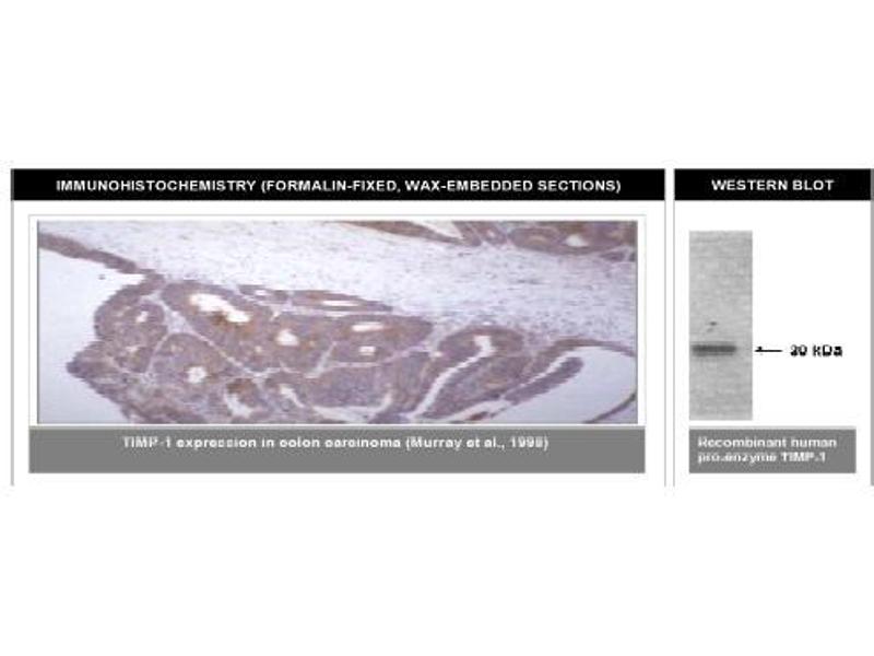 Der Maus Monoklonal anti-TIMP1 Antikörper wird verwendet zum Nachweis von TIMP1 in Proben von Human und Affe. Er wurde validiert für WB, EIA und IHC (fro).