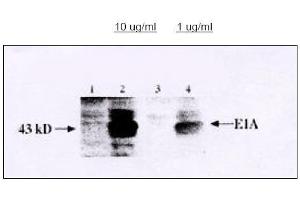 The early region (E1) of the adenovirus genome, responsible for transforming activity, is localized within the left most 11 % of the viral genome and consists of two transcriptional units E1A and E1B. E1A is sufficient for partial transformation and immortalization of primary cells. E1A gene products are necessary for normal levels of transcription of the other early regions of the adenovirus genome during productive infection and are able to either activate or repress the transcription of specific cellular genes. E1A forms specific complexes with cellular proteins including p105 causing inhibition of the cell cycle inducing arresting function of p105. EIA gene encodes potent onco-proteins that modify the normal transcriptional growth regulation of key cellular genes and thus alter cell cycle control.Synonyms: Adenovirus early region 1 antibody, Control protein E1A antibody, E1A antibody
