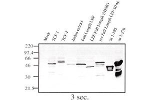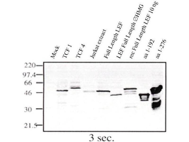 Lymphoid Enhancer Factor -1 is a transcription factor of the High Mobility Group of DNA binding proteins. It is one member of a family of four proteins referred to as LEF/TCF transcription factors (LEF-1, TCF-1, TCF-3 and TCF-4). These factors play a crucial role in WNT/WIngless signaling, a signal transduction cascade that directs cell differentiation. Aberrant activation of the WNT/Wingless pathway is also a root cause in the genesis of certain cancers such as colon cancer, melanoma and breast cancer.LEF-1 is expressed during development in many different differentiating tissues, and in a few tissues after birth. LEF-1 expression is required for proper development of breast, teeth, hair, whiskers and the trigeminal nerve. It is redundant with TCF-1 (for T Cell Factor-1) for correct development of T lymphocytes in the thymus. LEF-1 is a 399 amino acid protein that appears as a cluster of [polypeptides ranging in size between 55-57 kD on SDS-PAGE analysis. Alternative splice forms of LEF-1 and other LEF/TCF family members have been identified, but the expression pattern and relative abundance of these alternative forms have not been well studied. They can appear on westerns as smaller immunoreactive forms.Synonyms: LEF-1, Lymphoid enhancer-binding factor 1, T cell-specific transcription factor 1-alpha, TCF1-alpha