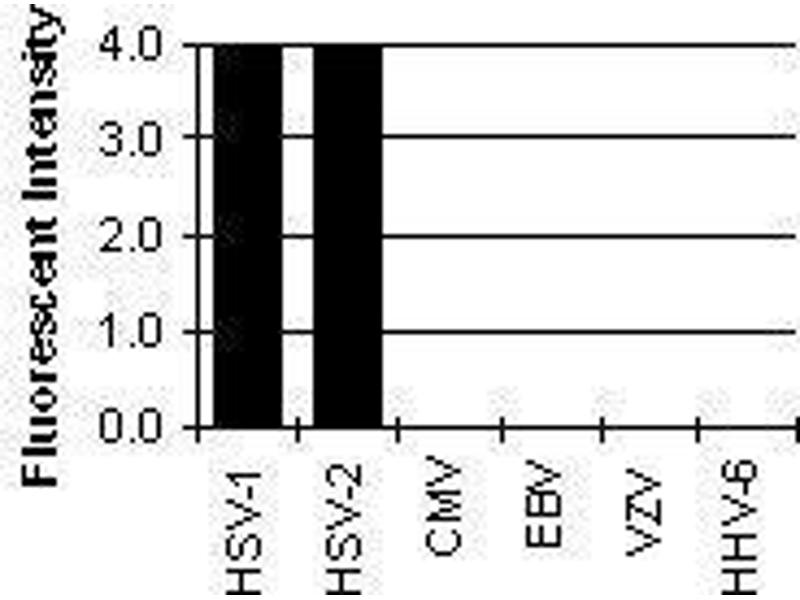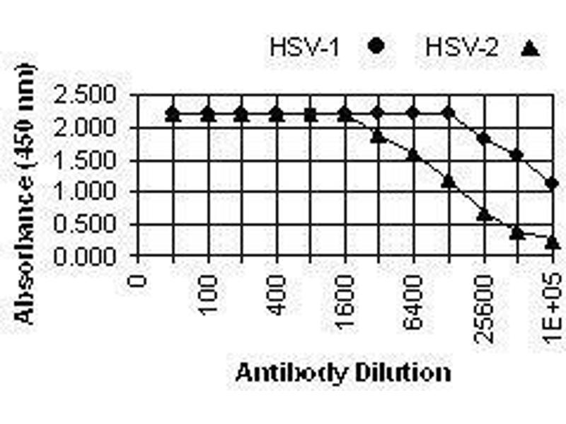 Immunofluorescence: HSV-1: 1+ at 1:25.600. HSV-2: 1+ at 1:6.400. ELISA: 0.100 at 1:102.400. Western Blotting: HSV-1: >1:12.800. HSV-2: >1:1.600