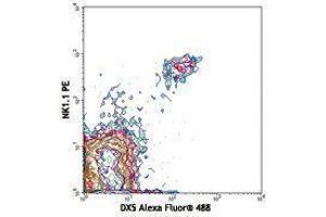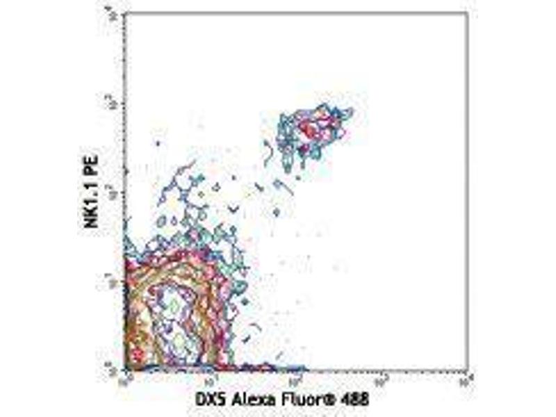 DX5 antigen has been recently characterized as CD49b. It is a 150 kD integrin α chain also known as α2 integrin, VLA-2 α chain, and integrin α2 chain. CD49b non-covalently associates with CD29 (β1 integrin) to form the CD49b/CD29 complex known as VLA-2, a receptor for collagen and laminin. CD49b is expressed on platelets, the majority of NK cells, NKT cells, and a small subset of CD8+ T cells (this population can be significantly increased following viral infection). DX5 is used for the identification and isolation of NK cells, and is especially useful for identifying NK cells in mice lacking the NK1.1 antigen.