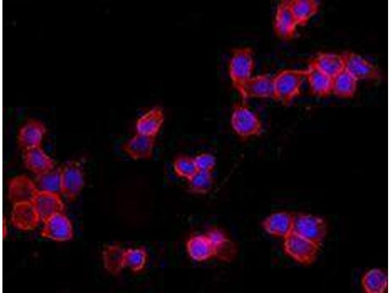 CD326 is also known as Ep-CAM, tumor associated calcium signal transducer 1, epithelial cell surface antigen, epithelial glycoprotein 2, EGP2, adenocarcinoma associated antigen, and TROP1. CD326 is a type I transmembrane protein containing six disulfide bridges and one THYRO domain. This cell surface glycosylated 40 kD protein is highly expressed in bone marrow, colon, lung, and most normal epithelial cells and is expressed on carcinomas of gastrointestinal origin. Recently, it has been reported that CD326 expression occurs during the early steps of erythrogenesis. CD326 functions as a homotypic calcium-independent cell adhesion molecule and is believed to be involved in carcinogenesis by its ability to induce genes involved in cellular metabolism and proliferation. CD326 antigen is an immunotherapeutic target for the treatment of human carcinomas.