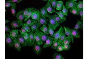Antigen Ki-67 is a nuclear protein expressed as two isoforms with molecular weights of 395 and 345 kD. Both isoforms contain one forkhead-associated domain and 16 concatenated "Ki-67 repeats," each containing the epitope recognized by the mAb Ki-67. The antigen Ki-67 interacts with Hklp2, hNIFK, and chromobox protein homolog 1, 3, and 5. Ki-67 is required for cell proliferation and its expression is restricted to the phases G1, S, G2, and M of the cell cycle. This characteristic makes Ki-67 an excellent marker for proliferating cells and is commonly used as one of the prognostic factors in cancer studies. Ki-67 has also been used to study myocyte proliferation after myocardial infarction as well as lymphocyte proliferation during infection, and has been used in neurons of patients with different neuropathologies.