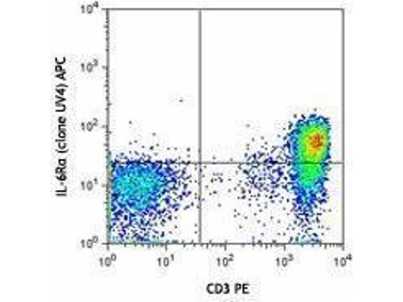 CD126 is an 80 kD IL-6 receptor α chain also known as IL-6R. It is a member of the immunoglobulin superfamily that is expressed on plasma cells, T cells, activated B cells, monocytes, granulocytes, hepatocytes, epithelial cells, and fibroblasts. Functional IL-6 receptors are formed by the non-covalent association of CD126 and the IL-6 receptor β chain (CD130 or gp130). CD126 binds IL-6 with low affinity but does not signal. The β chain (gp130, CD130) does not bind IL-6 by itself but associates with the α-chain/IL-6 complex to initiate signal transduction. IL-6 binding to the receptor complex results in the stimulation of B and T cells, and hematopoietic precursor proliferation and differentiation. A soluble form of CD126 has been found in human serum.