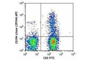 CD194, also known as CCR4, is a CC chemokine receptor. It binds CCL17 and CCL22 and is expressed on a subset of T and B cells, basophils, monocytes, and NK cells. Human Th2 cells are characterized by the expression of CCR4 and CCR8, and these receptors are regulated differently during Th2 development. Human peripheral blood Tregs can be divided into two distinct populations based on the expression of CCR4. Freshly isolated Tregs express CCR4 and presumably represent memory-type Tregs, and CCR4- Tregs require CD3-mediated activation to acquire a regulatory activity. Depletion of CCR4+ T cells leads to Th1-type polarization of CD4+ T cells and augmentation of CD8+ T cell responses to tumor antigens. CCR4 and its ligands are important for the recruitment of memory T cells into the skin in various cutaneous immune diseases.