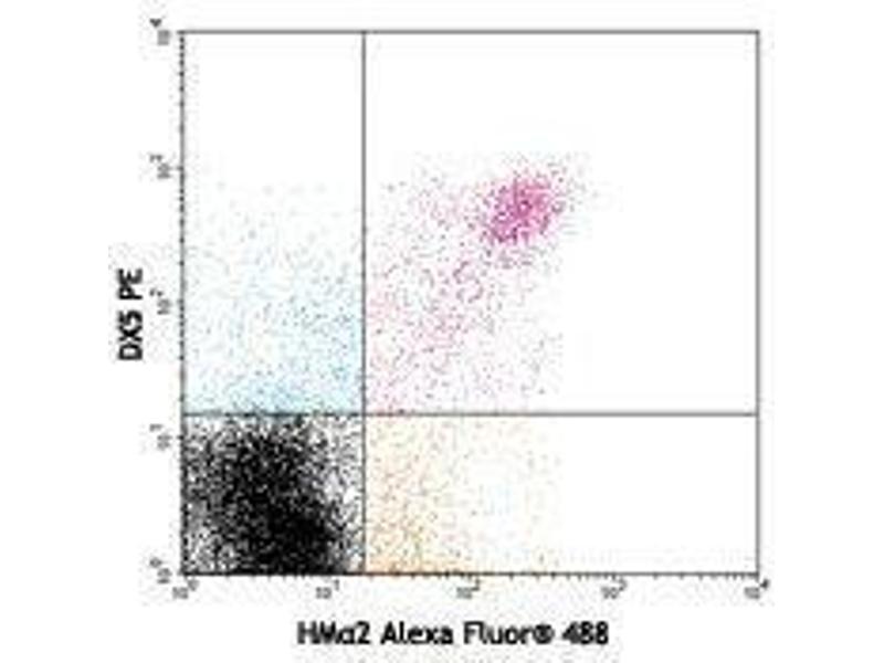 CD49b is a 150 kD glycoprotein, also known as α2 integrin, VLA-2 α chain, Integrin α2 chain, and HMα2. It is a member of the integrin family, expressed on NK cells, a subset of splenic CD4+ T cells, NK-T cells, intestinal intraepithelial and lamina propria lymphocytes, epithelial cells, and platelets. By associating with CD29 (integrin β1 subunit), CD49b forms the VLA-2 (integrin α2β1 ) complex. It plays a critical role in both adhesion and lymphocyte activation. The primary ligands for CD49b are collagen, laminin, and fibronectin. The HMα2 antibody has been shown to be useful for partially blocking CD49b mediated interactions with collagen. Additionally, this antibody blocks staining of splenic NK cells by the monoclonal antibody DX5.