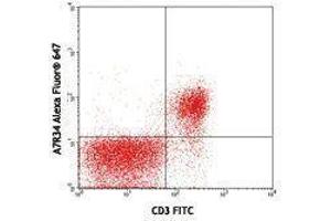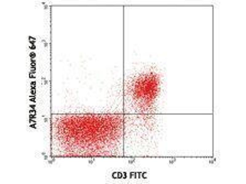 CD127 is a 60-90 kD type I transmembrane glycoprotein also known as IL-7 receptor α chain or IL-7Rα. It forms a heterodimer with the common γ chain (γc or CD132) which is shared with the receptors for IL-2, IL-4, IL-9, IL-13, IL-15, and IL-21. CD127 is expressed on immature B cells through early pre-B stage, thymocytes (except CD4/CD8 double positive thymocytes), peripheral T cells, and bone marrow stromal cells. CD127 has been reported to be an useful marker for identifying memory and effector T cells. The ligation of IL-7 with its receptor is important for stimulation of mature and immature T cells as well as immature B cells proliferation and development.