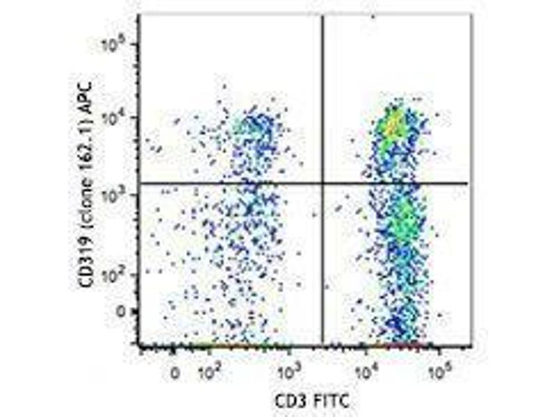 CD319 is a single-pass type l transmembrane glycoprotein, expressed on NK cells, subsets of mature dendritic cells, activated B cells, and cytotoxic lymphocytes, but not in promyelocytic, B or T cell lines. Expression is highest in the spleen, lymph nodes, and peripheral blood leukocytes, and lowest in bone marrow. Additionally, it is expressed in the small intestine, stomach, appendix, lung, and trachea. CD319 is tyrosine phosphorylated in activated NK cells and is associated with 19 and 39 kD proteins. CD319 has homology with the CD2 family of receptors within the Ig superfamily. Some of the CD2 members stimulate cytotoxicity through the CD319 associated protein.