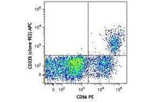 CD335, also known as NKp46, is a member of the natural cytotoxicity receptor (NCR) family which triggers cytotoxicity in NK cells. CD335 is direct-ly involved in target cell recognition and lysis, and is exclusively expressed on CD3-CD56+ NK cells, suggesting it is a universal marker for NK cells. NKp46, along with NKp30 and NKp44, is referred to as a natural cytoxicity receptor (NCR) and plays a very important role in killing virus-infected tumor cells and MHC-class I-unprotected cells.