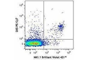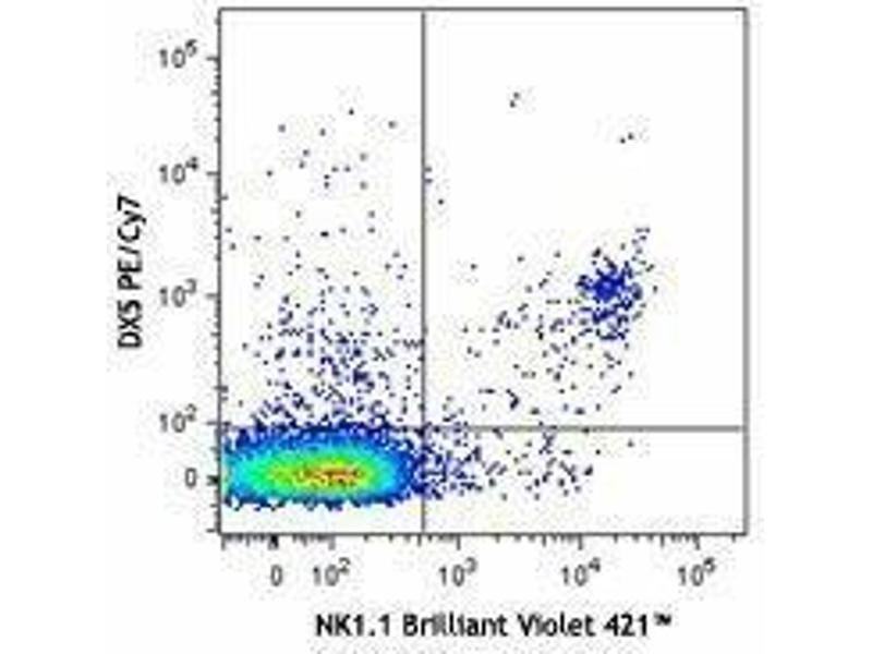 DX5 antigen has been recently characterized as CD49b. It is a 150 kD integrin α chain also known as α2 integrin, VLA-2 α chain, and integrin α2 chain. CD49b non-covalently associates with CD29 (β1 integrin) to form the CD49b/CD29 complex known as VLA-2, a receptor for collagen and laminin. CD49b is expressed on platelets, the majority of NK cells, NKT cells, and a small subset of CD8+ T cells (this population can be significantly increased following viral infection). DX5 is used for the identification and isolation of NK cells, and is especially useful for identifying NK cells in mice lacking the NK1.1 antigen.