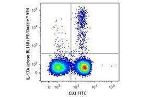 IL-17A is the founding member of the IL-17 family, a group of six structurally related pro-inflammatory cytokines. IL-17A, secreted by activated CD4+ Th17 cell subpopulation, elicits multiple biological activities on a variety of cells including: the induction of IL-6, IL-8, G-CSF, and PGE2 production in epithelial, endothelial or fibroblasts, the enhancement of surface expression of ICAM-1 in fibroblasts, activation of NF-κB and costimulation of T cell proliferation. Recent studies demonstrated that, in mice, activated IL-17-secreting CD4+ helper T cells (Th17 cells) mediate an autoimmune arthritis that clinically and immunologically resembles rheumatoid arthritis (RA). Human IL-17A shows 63 % , 63 %, and 72 % amino acid sequence identity to rat IL-17A, mouse IL-17A, and a protein encoded by the ORF13 gene of herpesvirus Saimiri (HVS), respectively.