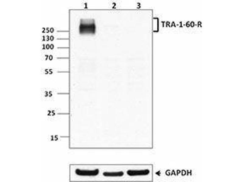 TRA-1-60-R antibody recognizes the neuraminidase resistant form of TRA-1-60. TRA-1-60 is a 200-240 kD cell surface antigen expressed by human embryonic stem cells (ESC), embryonic germ cells (EG), and embryonal carcinoma cells. The expression of TRA-1-60 on human ESC is downregulated upon differentiation. The soluble form of TRA-1-60 has been found in the serum of patients with embryonic cancers. Historically, TRA-1-60 is a neuroaminidase-sensitive (TRA-1-60-S) carbohydrate epitope expressed on podocalyxin, a member of the mucin-like glycoprotein CD34 family. Podocalyxin is a type I transmembrane sialoprotein with anti-adhesion properties. Further studies have shown that some of TRA-1-60 is neuraminidase resistant (TRA-1-60-R). The two forms of TRA-1-60 are essentially indistinguishable in terms of their cellular reactivity except for the difference in neuraminidase sensitivity. Both of TRA-1-60-S and TRA-1-60-R appear to be the same molecular weight glycoproteins detected by Western blot.
