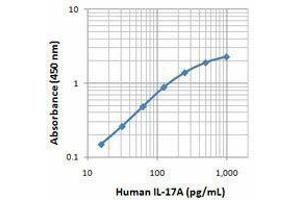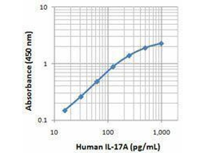 IL-17A is the founding member of the IL-17 family, a group of six structurally related pro-inflammatory cytokines. IL-17A, secreted by activated CD4+ Th17 cell subpopulation, elicits multiple biological activities on a variety of cells including: the induction of IL-6, IL-8, G-CSF, and PGE2 production in epithelial, endothelial or fibroblasts, the enhancement of surface expression of ICAM-1 in fibroblasts, activation of NF-κB and costimulation of T cell proliferation. Recent studies demonstrated that, in mice, activated IL-17-secreting CD4+ helper T cells (Th17 cells) mediate an autoimmune arthritis that clinically and immunologically resembles rheumatoid arthritis (RA). Human IL-17A shows 63 % , 63 %, and 72 % amino acid sequence identity to rat IL-17A, mouse IL-17A, and a protein encoded by the ORF13 gene of herpesvirus Saimiri (HVS), respectively.