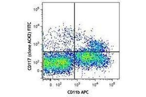 CD117 is a 145 kD immunoglobulin superfamily member, also known as c-Kit and stem cell factor receptor (SCFR). It is a transmembrane tyrosine-kinase receptor that binds the c-Kit ligand (also known as steel factor, stem cell factor, and mast cell growth factor). CD117 is expressed on hematopoietic stem cells (including multipotent hematopoietic stem cells, progenitors committed to myeloid and/or erythroid lineages, and T and B cell precursors), mast cells, and acute myeloid leukemia (AML) cells. CD117 interaction with its ligand is critical for the development of hematopoietic stem cells.
