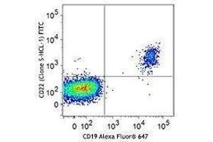 CD22 is a 130 kD type I transmembrane glycoprotein also known as Siglec-2 and BL-CAM and is a member of the immunoglobulin superfamily (sialoadhesion subgroup). CD22 is expressed in the cytoplasm of pro-B and pre-B cells, and on the surface of mature B and activated B cells, but not on plasma cells. CD22 is present in the B cell receptor complex and associates with SHP-1, Syk, Lck, Lyn, and phospholipase Cγ1. A primary function of CD22 is thought to be in limiting antigen receptor signaling by modulating B cell activation threshold. CD22 has been shown to bind to CD45RO and CD75, although the natural ligands for this molecule remain controversial.