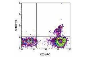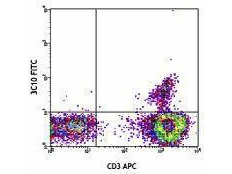 The 3C10 antibody recognizes the Vα7.2 T cell antigen receptor (TCR) α -chain segment which, joined with the Jα33 segment, constitutes an invariant TCR that is characteristics of the mucosal-associated invariant T cells (MAIT cells). MAIT cells are restricted by a nonpolymorphic class Ib major histocompatibility complex (MHC) molecule, MHC-related molecule 1 (MR1). MAIT cells are present in human blood (1-8 % of T cells), mesenteric lymph nodes, liver, and intestinal mucosa. MAIT cells play a role in detecting and fighting off microbial infections.