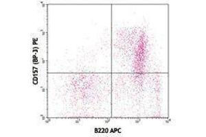 CD157 is an ectoenzyme member of the ADP-ribosyl cyclase family, also known as ADP-ribosyl cyclase 2, BST-1 (bone marrow stromal cell antigen 1), BP-3 antigen. It has a molecular weight between 40 - 46 kD and is a GPI-linked cell membrane glycoprotein which is expressed as a homodimer. CD157 is expressed by macrophages, neutrophils, bone marrow stromal cells, endothelial cells, follicular dendritic cells, and T and B cell progenitors prior to the rearrangement of the antigen receptors. Besides the ectoenzyme activity, it also plays a role in neutrophil migration and adhesion.