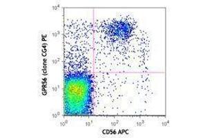 GPR56, also known as TM7XN1, is an orphan G-protein-coupled receptor (GPCR) containing seven transmembrane domains and a mucin-like domain in the N-terminal region. The total length of the human GPR56 gene is approximately 15 kb, and it consists of 13 exons and encodes 693 amino acids. GPR56 is expressed in a wide range of tissues, such as brain, thyroid gland, and heart. Mutations in human GPR56 gene were found to cause a specific brain malformation called bilateral frontoparietal polymicrogyria. Recently, GPR56 was found specifically expressed on cytotoxic NK and T lymphocytes, including CD8+, CD4+, and γδ T cells, which might affect the migratory properties of these cells. GPR56 was also found significantly downregulated in some cancer cells, suggesting that it may play a role in growth suppression and cancer metastasis.