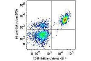Syk is a cytoplasmic 72 kD non-receptor tyrosine kinase that is widely expressed in hematopoietic cells. The Syk kinase associates with a number of proteins including c-Src, Lck, Lyn, Fyn, Vav1, STAT3, SHP1, Grb2, and LAT to couple immunoreceptors to downstream signaling events mediating cellular proliferation, differentiation, and phagocytosis. Syk is modified by phosphorylation on multiple tyrosine sites.