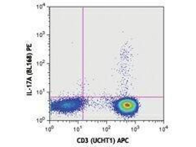 IL-17A is the founding member of the IL-17 family, a group of six structurally related pro-inflammatory cytokines. IL-17A, secreted by activated CD4+ Th17 cell subpopulation, elicits multiple biological activities on a variety of cells including: the induction of IL-6, IL-8, G-CSF, and PGE2 production in epithelial, endothelial or fibroblasts, the enhancement of surface expression of ICAM-1 in fibroblasts, activation of NF-κB and costimulation of T cell proliferation. Recent studies demonstrated that, in mice, activated IL-17-secreting CD4+ helper T cells (Th17 cells) mediate an autoimmune arthritis that clinically and immunologically resembles rheumatoid arthritis (RA). Human IL-17A shows 63 % , 63 %, and 72 % amino acid sequence identity to rat IL-17A, mouse IL-17A, and a protein encoded by the ORF13 gene of herpesvirus Saimiri (HVS), respectively.