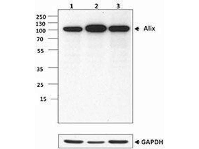 Alix (ALG-2-interacting protein X) is an adaptor protein that was first described for its capacity to bind to the calcium-binding protein ALG-2, the expression of which seemed necessary for cell death. Predicted molecular weight approximately 96 kD. Alix contains an N-terminal Bro1 domain and a C-terminal proline-rich domain (PRD). The PRD contains multiple polyproline motifs, which are potential docking sites for proteins containing SH3 domains, interactwith multiple cellular Alix-binding partners that are involvedin apoptotic induction, endosomal sorting,and endocytosis. Bro1 domain interacts with CHMP4b which is also involved in endosomal sorting.