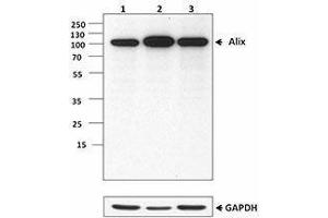 Alix (ALG-2-interacting protein X) is an adaptor protein that was first described for its capacity to bind to the calcium-binding protein ALG-2, the expression of which seemed necessary for cell death. Predicted molecular weight approximately 96 kD. Alix contains an N-terminal Bro1 domain and a C-terminal proline-rich domain (PRD). The PRD contains multiple polyproline motifs, which are potential docking sites for proteins containing SH3 domains, interactwith multiple cellular Alix-binding partners that are involvedin apoptotic induction, endosomal sorting,and endocytosis. Bro1 domain interacts with CHMP4b which is also involved in endosomal sorting.