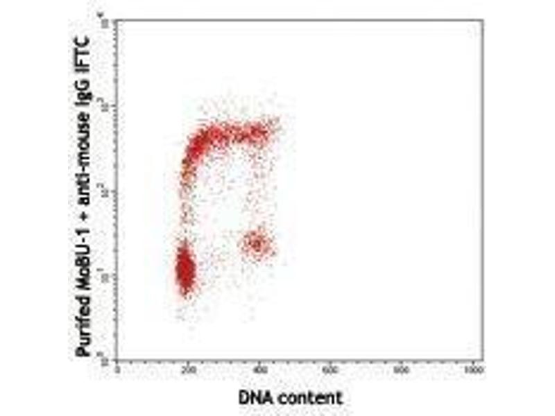 BrdU is a uridine derivative and a structural analog of thymidine that can be incorporated into DNA during the S-phase of the cell cycle as a substitute for thymidine. Cells can be pulse-labeled with BrdU and analyzed with antibodies against BrdU to determine the proportion of cells in the S-phase of the cell cycle during a given interval. The MoBU-1 antibody is useful for the detection of incorporated BrdU by fluorescent cell staining (ICFC), flow cytometry, and immunohistochemistry.