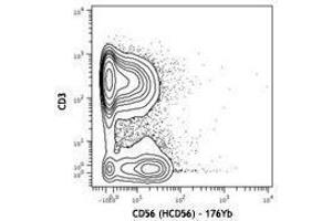 CD56 is a single transmembrane glycoprotein also known as NCAM (Neural Cell Adhesion Molecule), Leu-19, or NKH1. It is a member of the Ig superfamily. The 140 kD isoform is expressed on NK cells and NK-T cells. CD56 is also expressed in the brain (cerebellum and cortex) and at neuromuscular junctions. Certain large granular lymphocyte (LGL) leukemias, small-cell lung carcinomas, neuronal derived tumors, myelomas, and myeloid leukemias also express CD56. CD56 plays a role in homophilic and heterophilic adhesion via binding to itself or heparin sulfate.