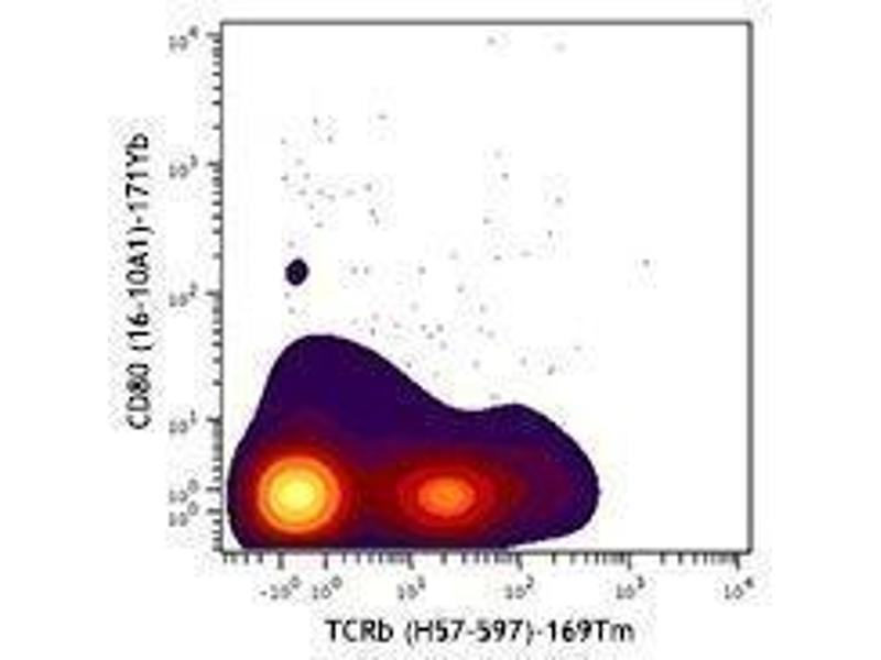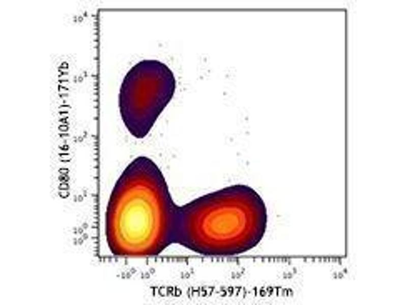 CD80 is a 60 kD highly glycosylated protein. It is a member of the Ig superfamily and is also known as B7-1, B7, and Ly-53. CD80 is constitutively expressed on dendritic cells and monocytes/macrophages, and inducibly expressed on activated B and T cells. The ligation of CD28 on T cells with CD80 and CD86 (B7-2) on antigen presenting cells (such as dendritic cells, macrophages, and B cells) elicits co-stimulation of T cells resulting in enhanced cell activation, proliferation, and cytokine production. CD80 appears to be expressed later in the immune response than CD86. CD80 can also bind to CD152, also known as CTLA-4, to deliver an inhibitory signal to T cells.