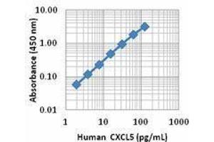 CXCL5 is a member of the CXC family of chemokines, also known as epithelial activated peptide 78 (ENA-78). The precursor of CXCL5 contains 114 amino acids, with a signal peptide of 36 amino acids which is cleaved to generate the 78 amino acid mature protein (8 kD). CXCL5 is expressed by monocytes/macrophages, endothelial cells, vascular smooth muscle cells, epithilial cells, and eosinophils. CXCL5 is an inflammatory cytokine which binds to the cell surface receptor CXCR2 and induces chemotaxis of neutrophils to a target site. High levels of CXCL5 have been associated with prostate, gastric, and pancreatic cancer progression.