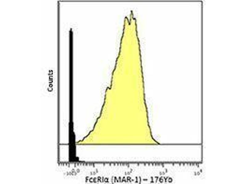 FcεRIα is a transmembrane protein belonging to the Ig superfamily. FcεRIα forms a tetrameric complex with one β and two γ-subunits. The FcεRI complex plays an important role in triggering IgE-mediated allergic reactions. It is abundantly expressed on mast and basophils and up-regulated by the presence of IgE. Following stimulation via Fcε RIα, mast cells and basophils release bioactive chemical mediators such as histamine, resulting in the initiation of allergic reactions. Cross linking of the high-affinity receptor for IgE on tissue mast cells triggers immediate hypersensitivity with local symptoms. The MAR-1 monoclonal antibody reacts with the FcεRIα subunit.