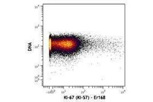 Antigen Ki-67 is a nuclear protein expressed as two isoforms with molecular weights of 395 and 345 kD. Both isoforms contain one forkhead-associated domain and 16 concatenated "Ki-67 repeats," each containing the epitope recognized by the mAb Ki-67. The antigen Ki-67 interacts with Hklp2, hNIFK, and chromobox protein homolog 1, 3, and 5. Ki-67 is required for cell proliferation and its expression is restricted to the phases G1, S, G2, and M of the cell cycle. This characteristic makes Ki-67 an excellent marker for proliferating cells and is commonly used as one of the prognostic factors in cancer studies. Ki-67 has also been used to study myocyte proliferation after myocardial infarction as well as lymphocyte proliferation during infection, and has been used in neurons of patients with different neuropathologies.