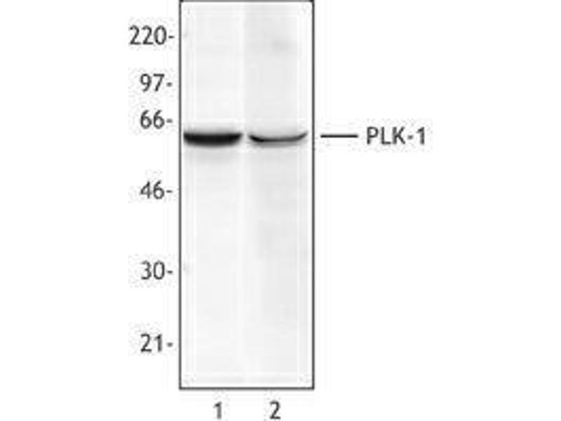 PLK-1 (polo-like kinase 1) is a member of te serine/threonine protein kinase family, cdc5/polo subfamily. Highly homologous to polo-like kinase (Drosophila), PLK-1 contains two polo box domains with a predicted molecular weight of 68 kD. This nuclear protein is highly expressed in placenta and colon and has been shown to regulate cdc2/cyclin B through phosphorylation and activation of cdc25c phosphatase. PLK-1 may also be required for cell division, depletion of PLK-1 results in apoptosis. PLK-1 is upregulated by growth stimulating agents and is regulated by cell cycle position (highest in G2/M phase, declining to nearly undetectable levels after mitosis and throughout G1). PLK-1 is modified by phosphorylation (Thr210 is the major phosphorylation site in activated PLK-1 from mitotic cells) and has been shown to interact with nuclear distribution gene C. The 3F8 monoclonal antibody recognizes human and mouse PLK-1 and has been shown to be useful for Western blotting.