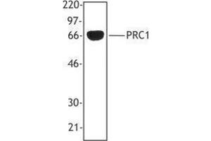PRC1 (also known as protein regulator of cytokinesis 1 and mitotic spindle-associated CDK substrate) is a member of the MAP65/ASE1 family with a molecular weight of approximately 72 kD. PRC1 localization changes with cell-cycle position and can be found in the nucleus, the mitotic spindle, and the cell mid-body. PRC1 is a mitotic spindle-associated CDK substrate protein required for cytokinesis and maintenance of the spindle midzone. PRC1 can be modified by phosphorylation and has been shown to interact with Cdc2 and Cdk2. The 6G2 antibody recognizes the human PRC1 protein and has been shown to be useful for Western blotting.
