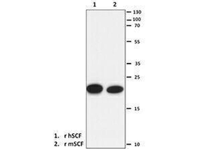 - Stem Cell Factor (SCF) is initially synthesized as membrane-bound forms of 248 or 220 amino acids, depending on the alternative splicing of exon 6. The 248 amino acid form contains a proteolytic cleavage site encoded by exon 6, and it is cleaved from the cell to release an active soluble protein of 165 amino acid residues. Soluble SCF is glycosylated at both N-linked and O-linked sites. MMP-9 plays a physiological role in SCF release from the membrane, and this action plays a significant role in differentiating and mobilizing stem and progenitor cells from the bone marrow. SCF increases the proliferation of myeloid and lymphoid hematopoietic progenitors in bone marrow cultures. SCF/c-kit interaction in mast cells results in mast cell degranulation that induces the release of mediators, such as histamine and inflammatory cytokines and chemokines. Also, activation of c-kit in dendritic cells regulates T helper cell differentiation and allergic asthma. In addition, SCF plays an important role in revascularization of ischemic limbs. Ischemia induces plasma elevation of SCF, thrombopoietin (TPO), erythropoietin (EPO), and GM-CSF albeit at lower levels. SCF and TPO induce the release of CXCL12 from platelets, which increase CXCL12 levels in plasma. This results in an extensive mobilization of CXCR4+VEGFR1+ cells (hemangiocytes) that accelerate revascularization of the ischemic limbs. SCF binds to its receptor c-kit, which belongs to the type III tyrosine kinase family whose members include receptors for M-CSF and PDGF.