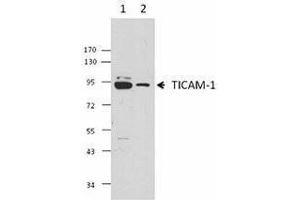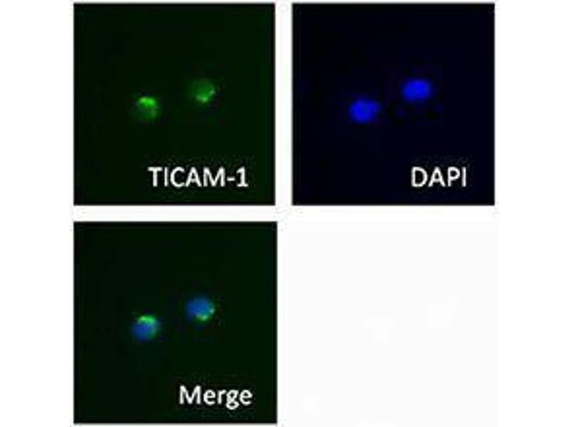TICAM-1, also known as TRIF, is an intracellular adaptor protein utilized by TLR3 and TLR4. TLR3 recognizes double stranded viral RNA and induces TICAM-1 mediated type I interferon production. The N-terminal region of TICAM-1 recruits TBK1 and IKKi, which in turn phosphorylates the interferon regulatory transcription factor IRF3. The phosphorylated IRF3 is subsequently dimerized and translocates to the nucleus, resulting in transcriptional activation of the gene encoding IFN-β. Mice lacking in TICAM-1 expression are defective in the TLR3 mediated induction of proinflamatory cytokines, suggesting that TICAM-1 is crucial for TLR3 downstream signaling. TICAM-1 also mediates TLR4-induced signaling in the presence of the adaptor molecule TRAM. The C-terminal region of TICAM-1 recruits RIP1 and induces apoptosis through FADD/caspase cascade.