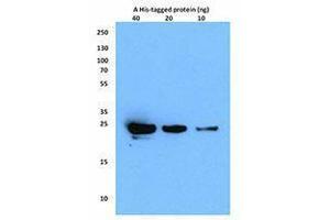 This antibody was raised against linear 8XHis tag. It reacts with His tag protein, either C, N, or internal His6 and up repeats. It can be used for Western blotting to detect linear His repeat (His6 or more). It can also be used for ICFC and IF staining of His-Tagged protein.