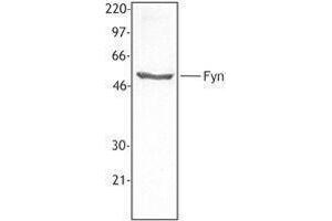 Fyn is a 59 kD protein tyrosine kinase and a member of the src subfamily. There are two reported isoforms of Fyn, FynT found in T cells, B cells and thymocytes, and FynB found in neuronal cells. Fyn has been shown to control cell growth, interact with the p85 subunit of PI3K, control high affinity IgE receptor-mediated mast cell degranulation, and participate in neuronal cell signaling. Fyn can be activated by T cell receptor engagement or anti-CD3 ligation. Fyn is known to be modified by phosphorylation and palmitoylation and has been shown to interact with Fyn binding protein, p85 PI3K, high affinity IgE receptor, and NCAM140. The FYN-59 monoclonal antibody recognizes human and mouse Fyn and has been shown to be useful for Western blotting, immunoprecipitation, and immunohistochemistry.