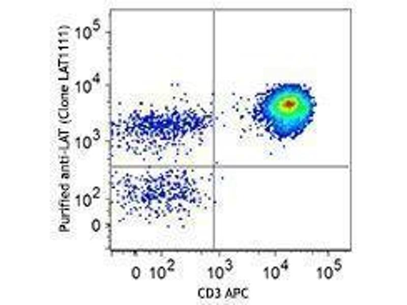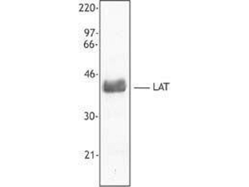LAT (linker for activation of T-cells) is a 36 kD phospho-tyrosine adaptor protein containing SH2 domains and a CVRC motif. Two LAT isoforms have been reported with approximate molecular weights of 36 kD and 38 kD. LAT is localized to lipid rafts, and is also a potential type III transmembrane protein, thought to be expressed in the juxtanuclear intracellular compartment. LAT links TCR engagement to Ras-MAPK activation, Ca2+ flux, IL-2 expression and is required for T-cell development. LAT is phosphorylated when activated by TCR cross-linking, where it recruits signaling molecules. LAT activation can be prevented by polyunsaturated fatty acids. LAT is modified by ZAP-70 and Syk phosphorylation and can also be palmitoylated. LAT has been reported to be associated with Grb2, Gads, Grap, PLC-γ1, p85 subunit PI3K, ZAP-70, Syk, Itk, Vav, SLP-76, and cbl.